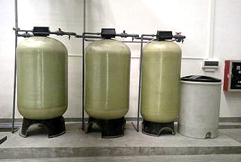 該產品是采用強酸性苯乙烯係鈉型樹脂(NaR)將原水中的硬度成分Ca2+、Mg2+置換出去,使原水得到軟化,其反應為:2NaR+Ca2+(Mg2+)=R2Ca(Mg)+2Na+。當樹脂置換到一定量的鈣、鎂後,就會失去置換能力;可以用一定濃度的鹽水浸泡,使其恢複交換能力,其反應式為:R2Ca(Mg)+2Na+=2NaR+Ca2+(Mg2+)。再生過程包括:反洗(鬆動樹脂層)—吸鹽慢洗(置換過程)—正洗(將鈣、鎂離子衝掉)—注水(為下次再生準備)。